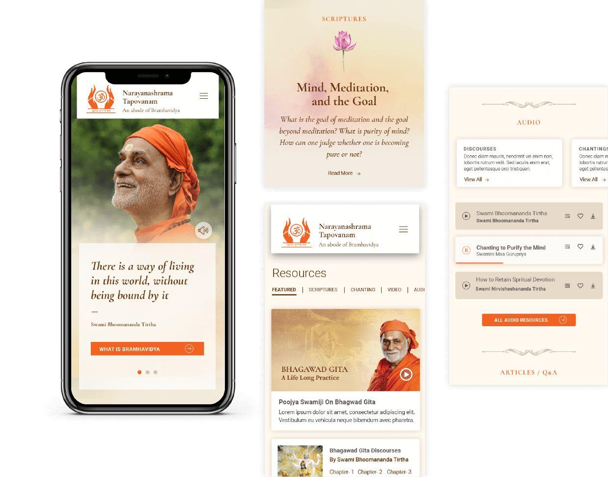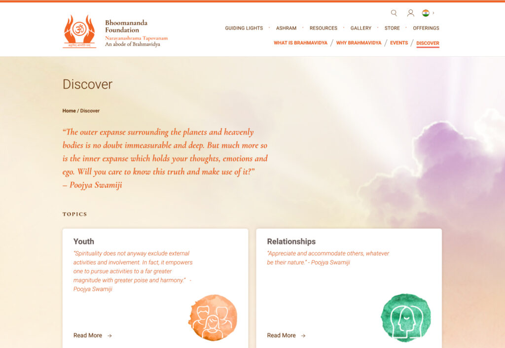 The Ashram website has traditionally been just informative, a collection of writings and filing of some resources. During the 2020-2022 Covid pandemic, it became imperative for the Ashram to keep in touch with its community worldwide through video calls and emailers. This was also seen as an opportunity to connect with a much larger audience and spread the message as far and wide as possible, still keeping the strong central character and the way of life intact. The idea was not to make a marketing machine, but become a repository of knowledge to the seekers.