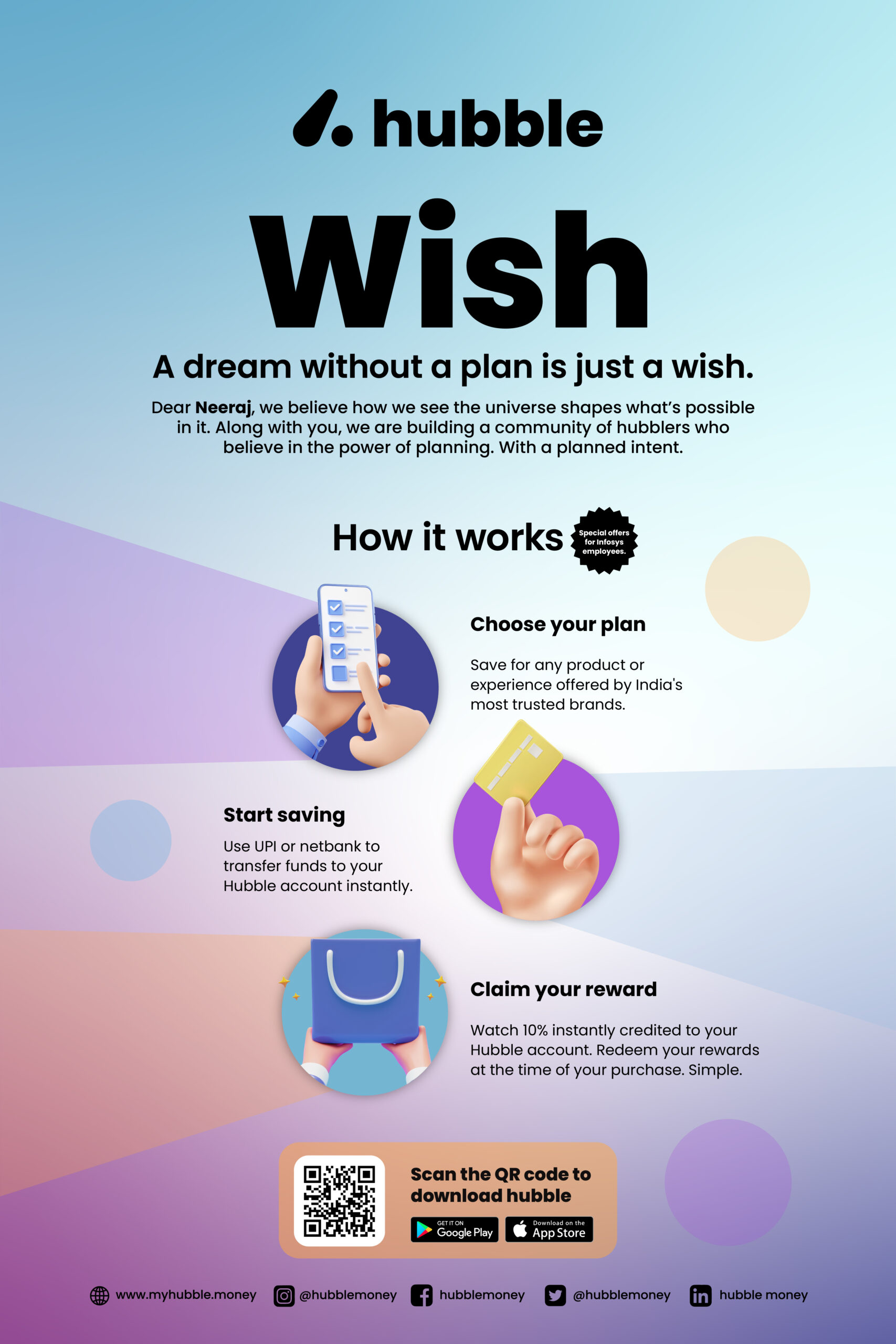 The collaboration began with a deep dive into the “plumbing” of the fintech industry. We worked closely with the founders to understand the mechanics of their brand partnerships and the rigorous math that allowed them to offer significant discounts. By stripping away dense financial jargon, we distilled their core proposition into a single, defiant question: Why should those who borrow get more rewards than those who save? We moved the conversation away from traditional banking tropes and toward a philosophy of rewarded restraint. Hubble isn’t just a utility; it is a system that recognizes the hard work of planning for a dream phone, a new bike, or a first international holiday. We translated the “10% reward” math into a simple, relatable mechanic: save in equal installments and get the final installment as a reward from the brand. To make this new financial universe legible, we developed a communication strategy that turned “wishes” into “plans.” Using the insight that a dream without a plan is just a wish, we framed the benefits through tangible aspirations: