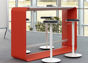 The Hoop by Haworth is a standing-height, low footprint table for impromptu conversation in a small group. Its lightweight construction makes it easy to pull around.