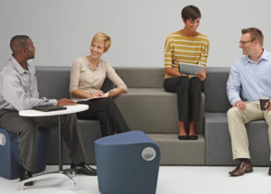 Allsteel ‘Rise’ tiered modular stadium seating supports all kinds of casual work postures while brainstorming and sharing.