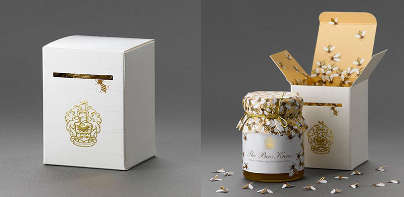 The Bees Knees honey box opens to reveal a bee covered honey comb pattern as well as small diecut bees packaged inside each box. -