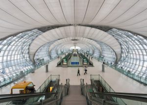 A predominantly concrete, steel and glass structure, Bangkok’s Suvarnabhoomi Airport has large fabric spans that impart a very distinct look. Interestingly, the overall shape of the structural unit is a very simple one